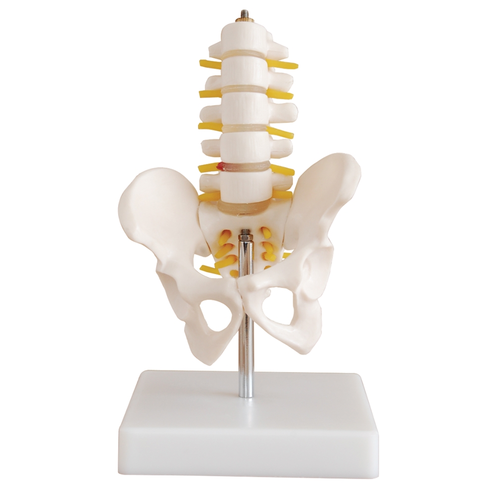 De intervertebrale disci er fremstillet i beige/transparente materialer, og nerverødderne er tydeligt markeret i gul farve. Det gør modellen særligt velegnet til undervisning i ryg- og bækkenanatomi samt til patientforklaring af fx nerverodspåvirkning og lænderygrelaterede problematikker. Modellen leveres monteret på en stabil stander for optimal visning.