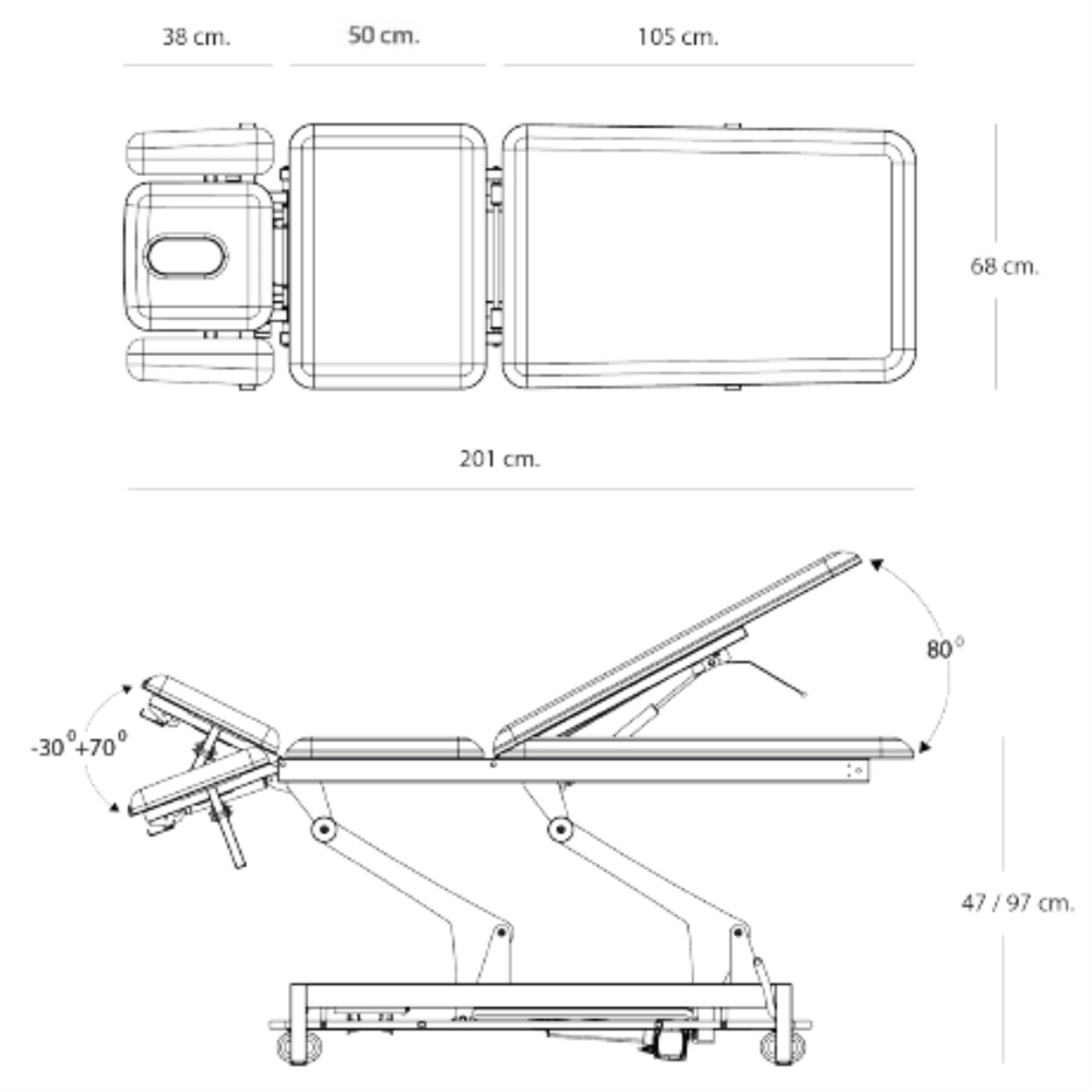 Højdejustering: 360º (kan styres helevejen rundt om briksen via. fodbøjle) elektrisk højdejustering