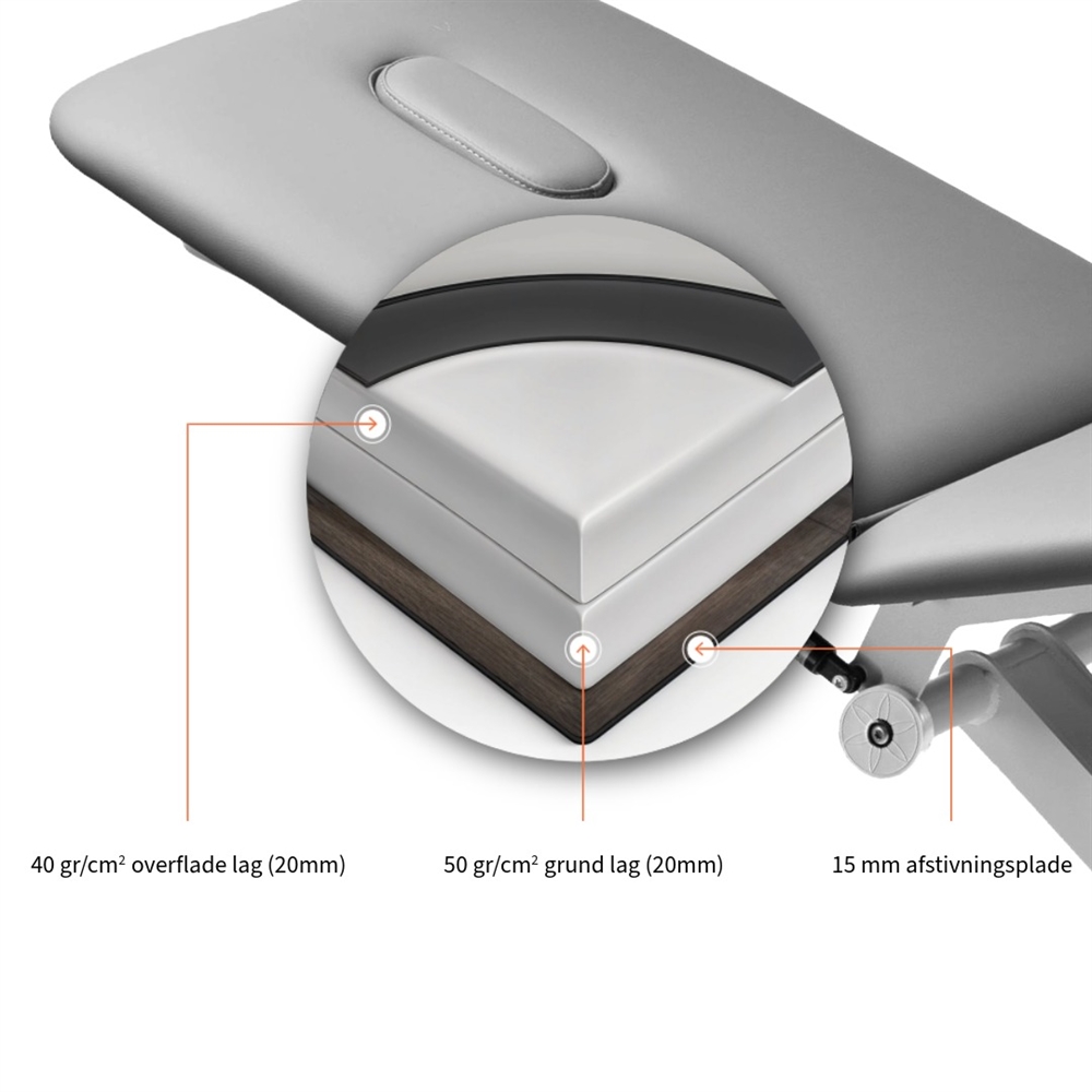• Hygiejnisk: Briksens overflade er lavet i medicinsk godkendt kunststof, som gør rengøring og desinfektion enkel, så du kan opretholde en ren og sikker arbejdsplads.