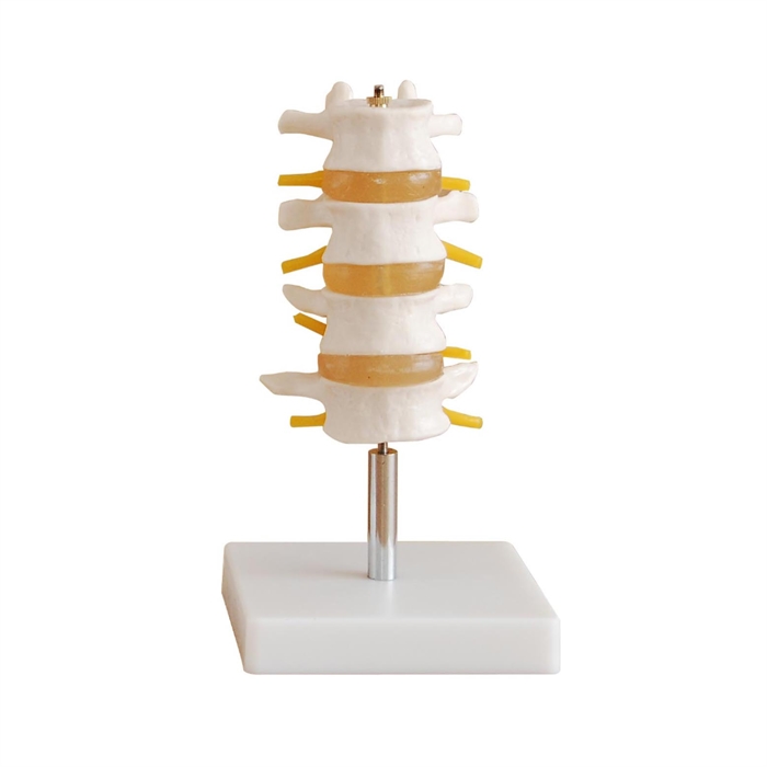 De intervertebrale disci er fremstillet i beige/transparente materialer, mens nerverødderne er markeret i gul, hvilket giver et tydeligt visuelt overblik. Modellen leveres monteret på en stabil stander, så strukturerne let kan demonstreres under undervisning og patientforklaring.