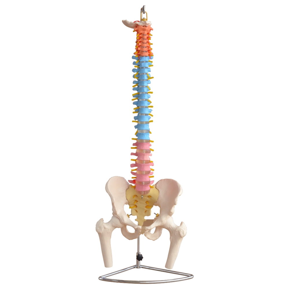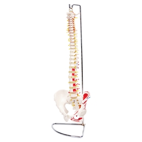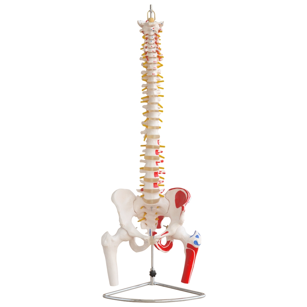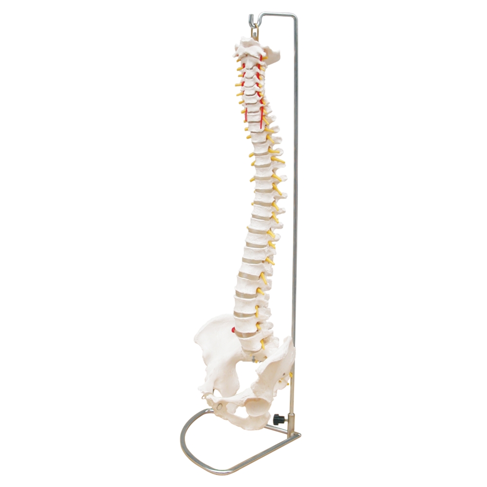 Rygsøjlen er fleksibel og leveres komplet med bækken, sacrum og occipitalben. De tydelige nervegrene gør modellen oplagt til at forklare udstrålende symptomer og sammenhængen mellem segment, nerverod og smerteområde.
